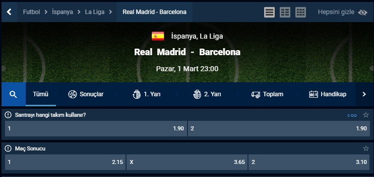 Güvenilir bahis ve casino sitesi Tümbet Real Madrid – Barcelona Maçı için vermiş olduğu Real Madrid galibiyeti için 2.15 oran Barcelona galibiyeti için ise 3.10 oran vermektedir. Yüksek bahis oranları ile hem ilk yatırımlarınızda %100 Hoşgeldin Bonusu ile güzel kazançlar elde edebilirsiniz. Tumbet avantajlı bahis oranları canlı bahis ve bahis bozdurma imkanı sizlerle. Curaçao lisansı ile kendi alt yapısı ile canlı casino ve bahis sevenlere güven vermektedir.